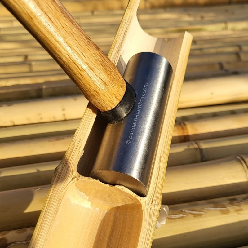 Si vous avez fendu un bambou en 2, vous pouvez observer qu'il reste le diaphragme intérieur au niveau de chaque nœud à l'intérieur de la tige. Ce diaphragme se casse facilement à l'aide d'un marteau, idéalement à panne ronde pour le casser proprement à la base. Bien sûr, ce marteau a aussi toutes les fonctions d'un marteau classique, et vous pouvez aussi par exemple l'utiliser pour enfoncer des clous, taper sur votre hachette pour l'enfoncer dans le bambou, etc...